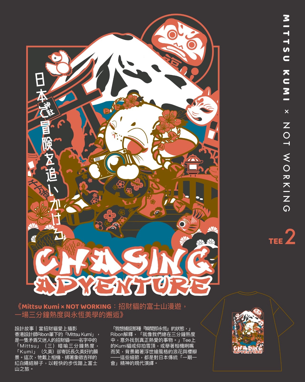 「我想捕捉那種『瞬間即永恆』的狀態,」Ribon解釋,「就像我們總在三分鐘熱度中,意外找到真正熱愛的事物。」Tee上的Kumi貓或仰拍雪頂,或舉著相機咧嘴而笑,背景藏著浮世繪風格的浪花與櫻瓣——這些細節,都是對日本傳統「一期一會」精神的現代演繹。